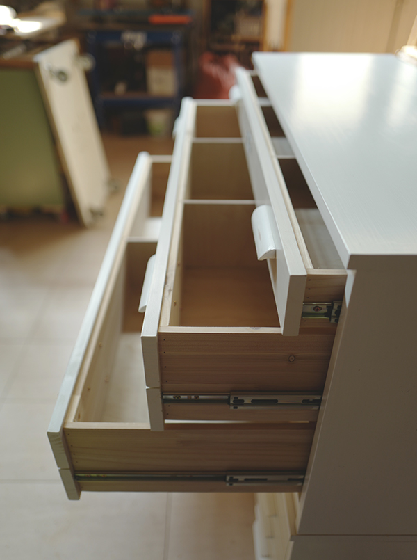 서랍장 몸통은 화이트, 서랍앞판은 미색의 그레이 컬러로 마감을 하여